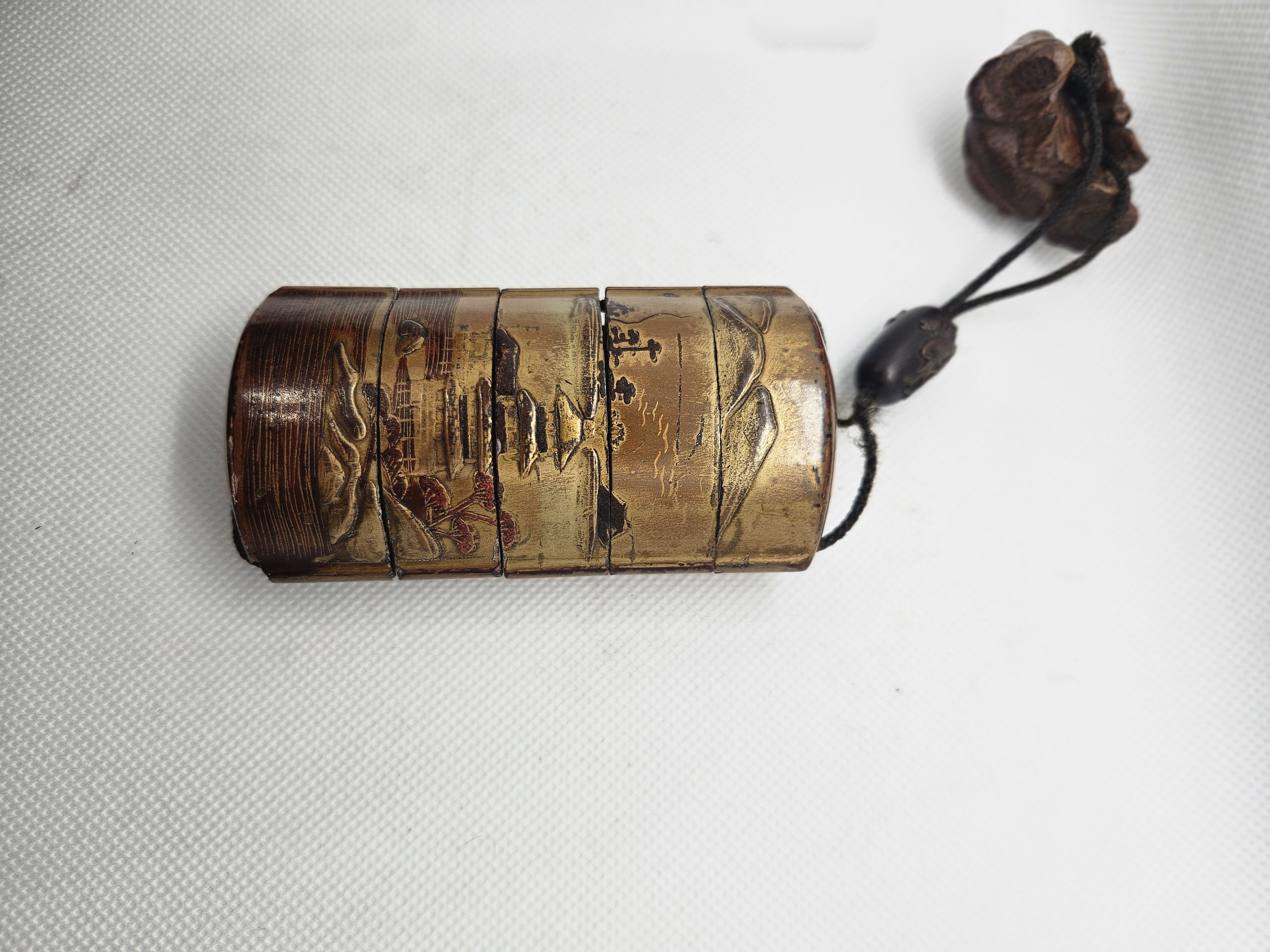 4-Case Lacquer Inrō with Shakudō Ojime and Carved Wood Netsuke