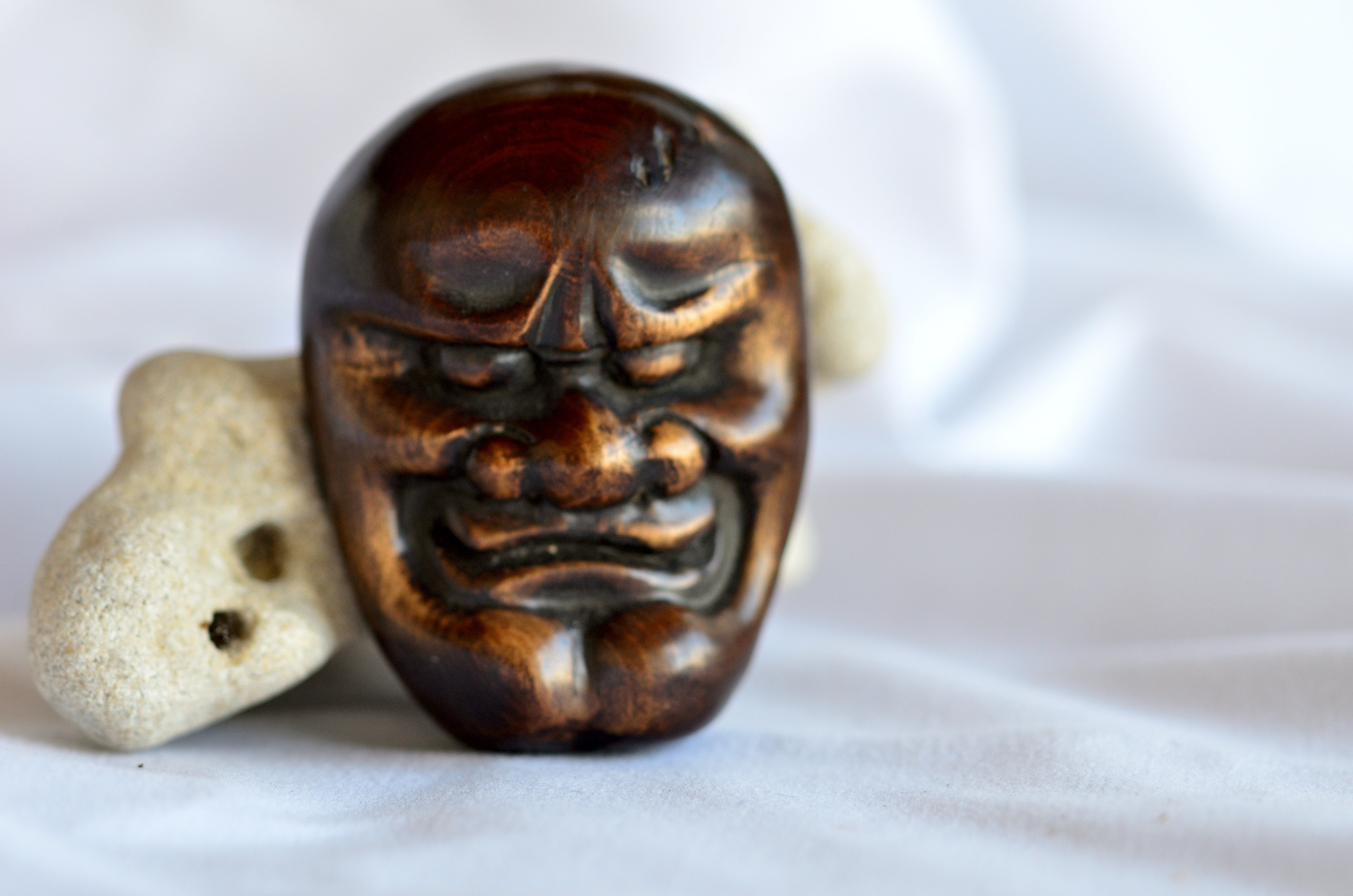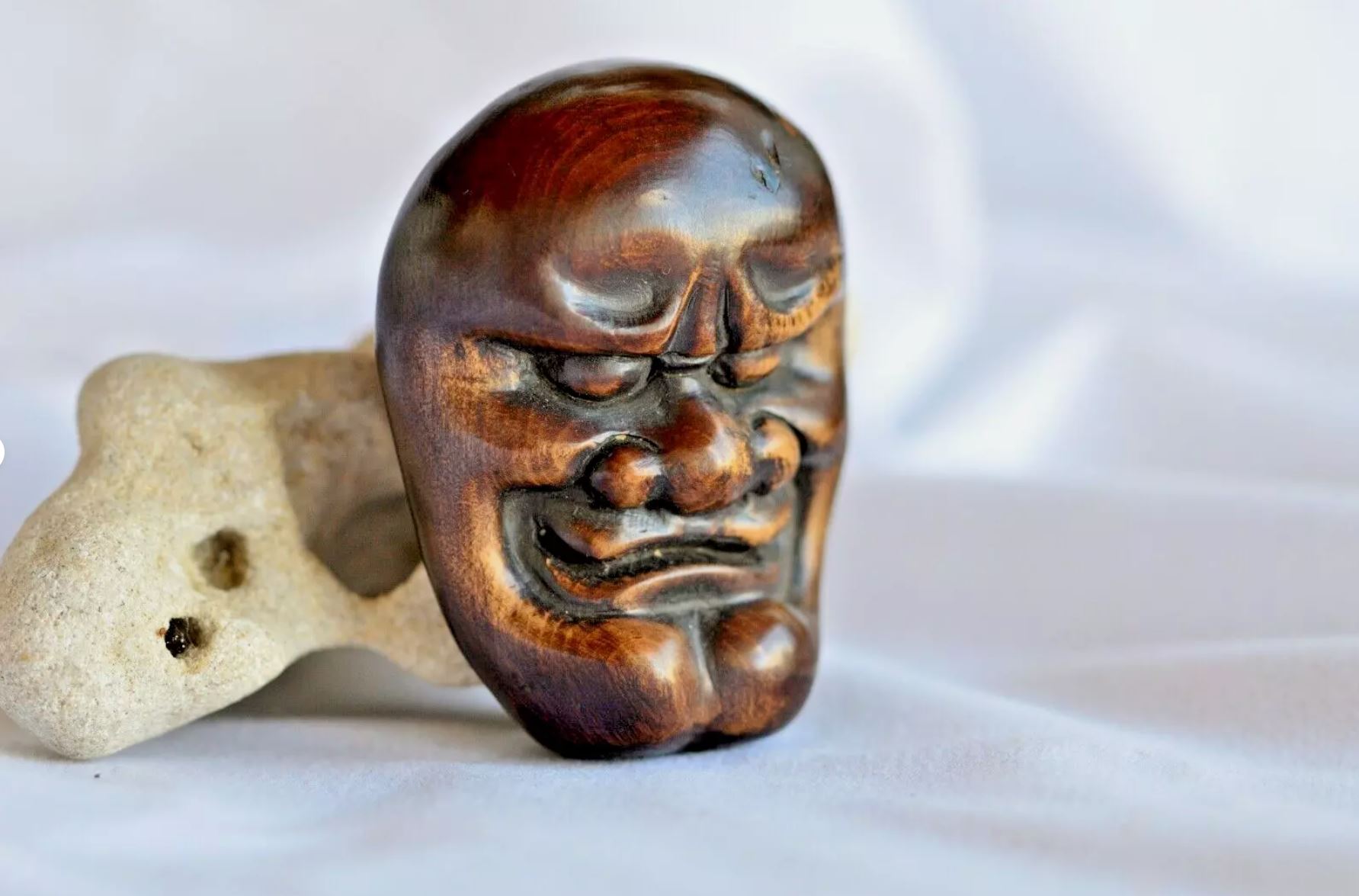 Antique Noh theater 2″ netsuke mask of Kurohige 黒髭 (a dragon god)