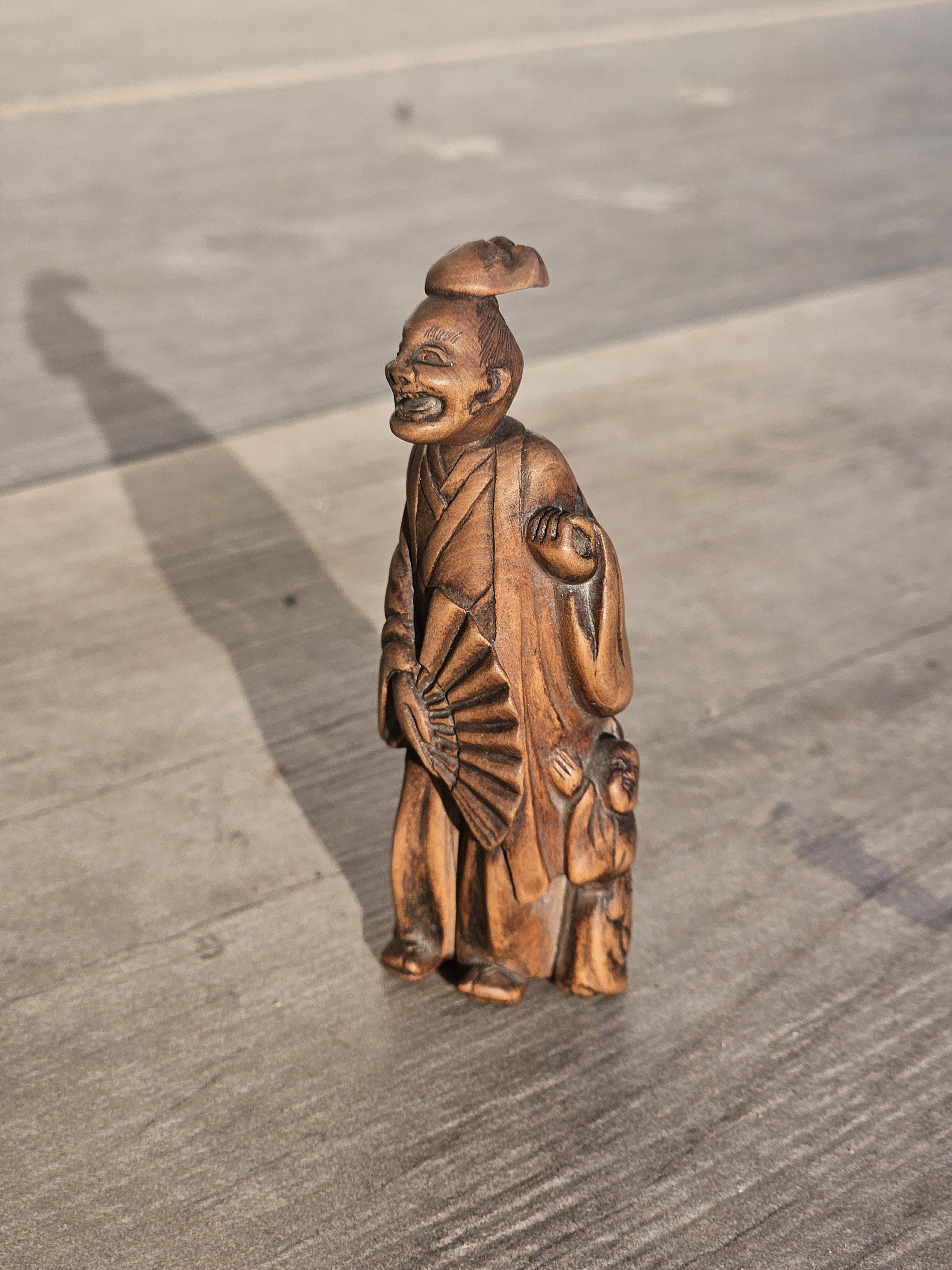 The tall standing format, expressive faces, and detailed fan and mask make this a particularly attractive and collectible example of Meiji wood carving.