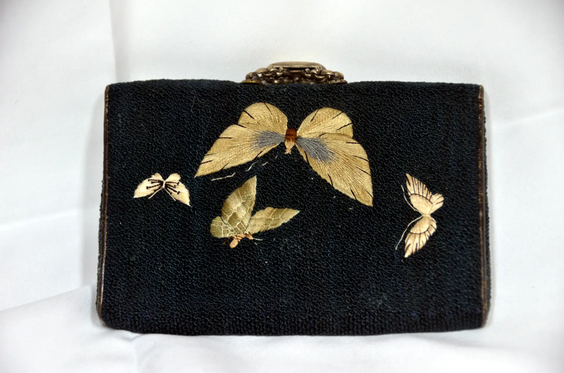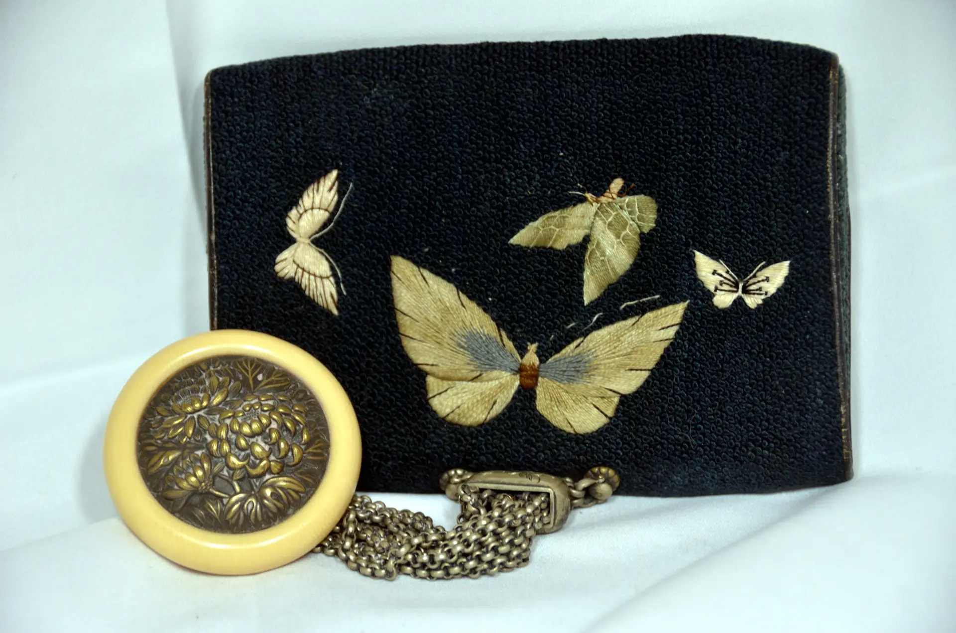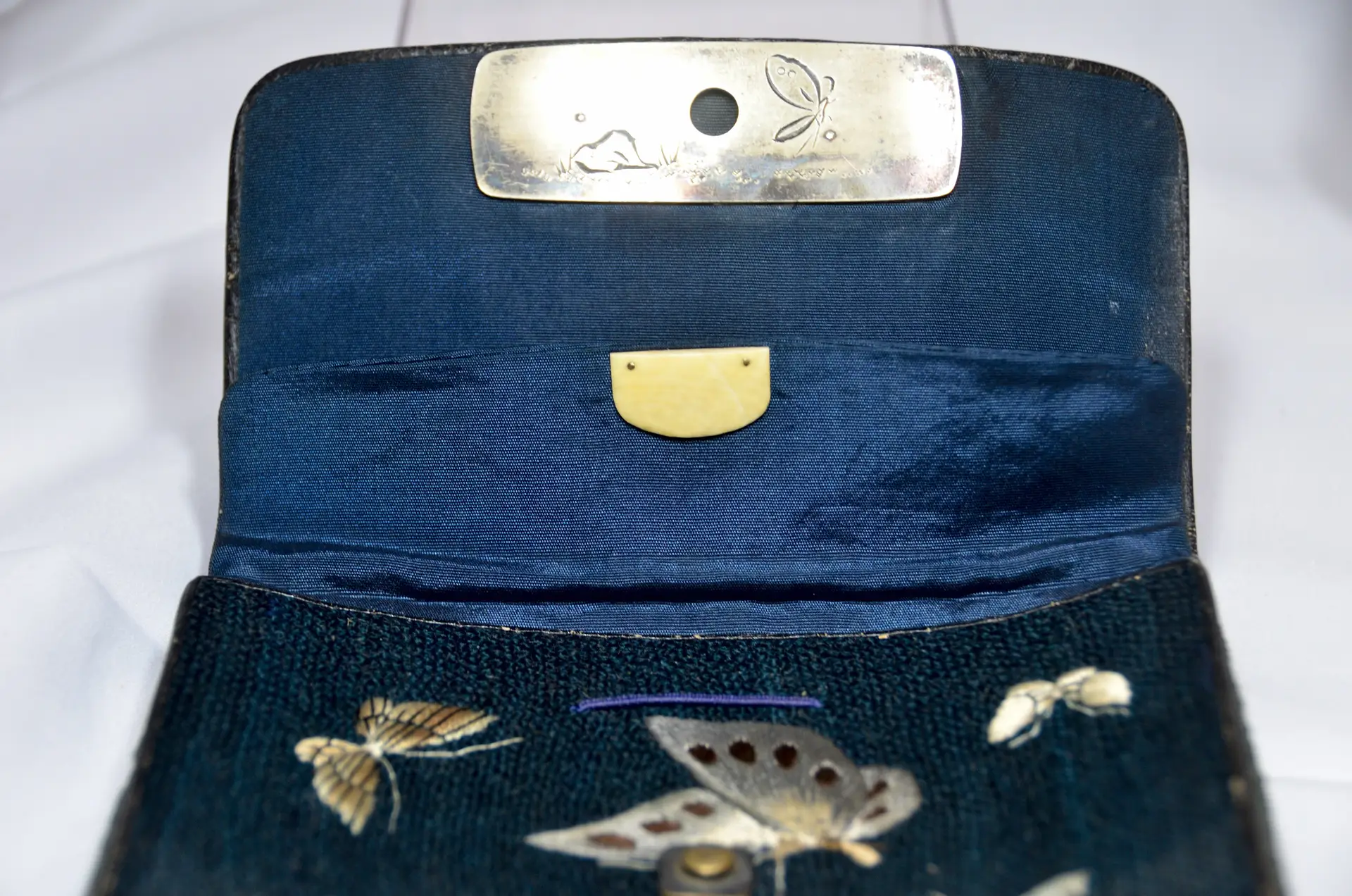 Second pouch in blue cotton, decorated with embroidered butterflies, fitted with a silver clasp and similarly connected by chains to a matching kagamibuta, the bowl in silver and the rim in ivory, forming a harmonious companion piece to the first.