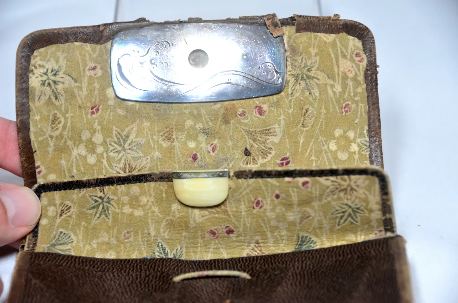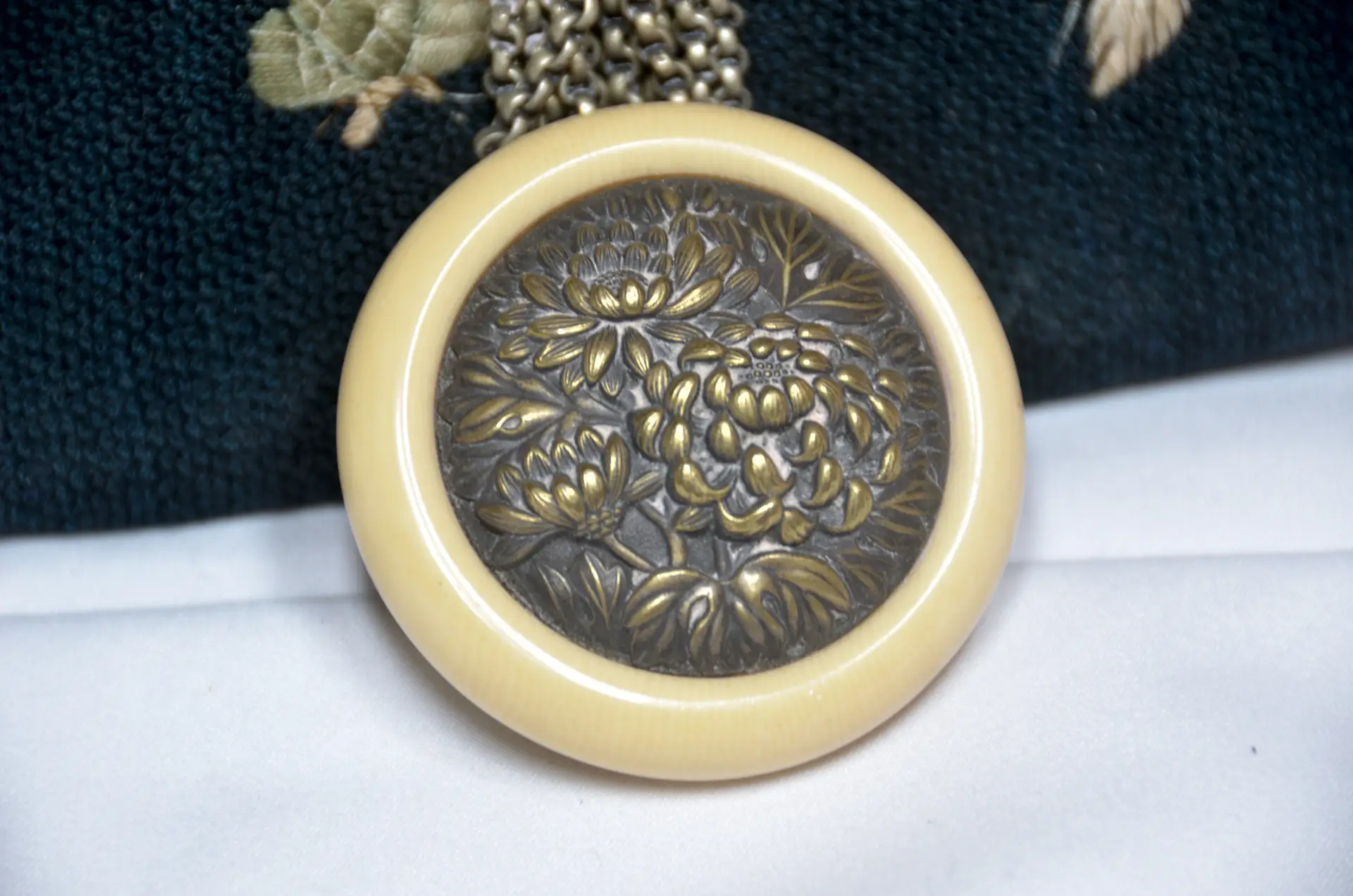 First pouch in brown silk brocade, decorated with maple leaves, with a silver clasp in the form of a dragon, attached by silver chains to a kagamibuta netsuke framed in ivory and featuring a silver plate with a dragon among auspicious characters 福 (fuku – good fortune) and 壽 (ju – longevity) in relief.