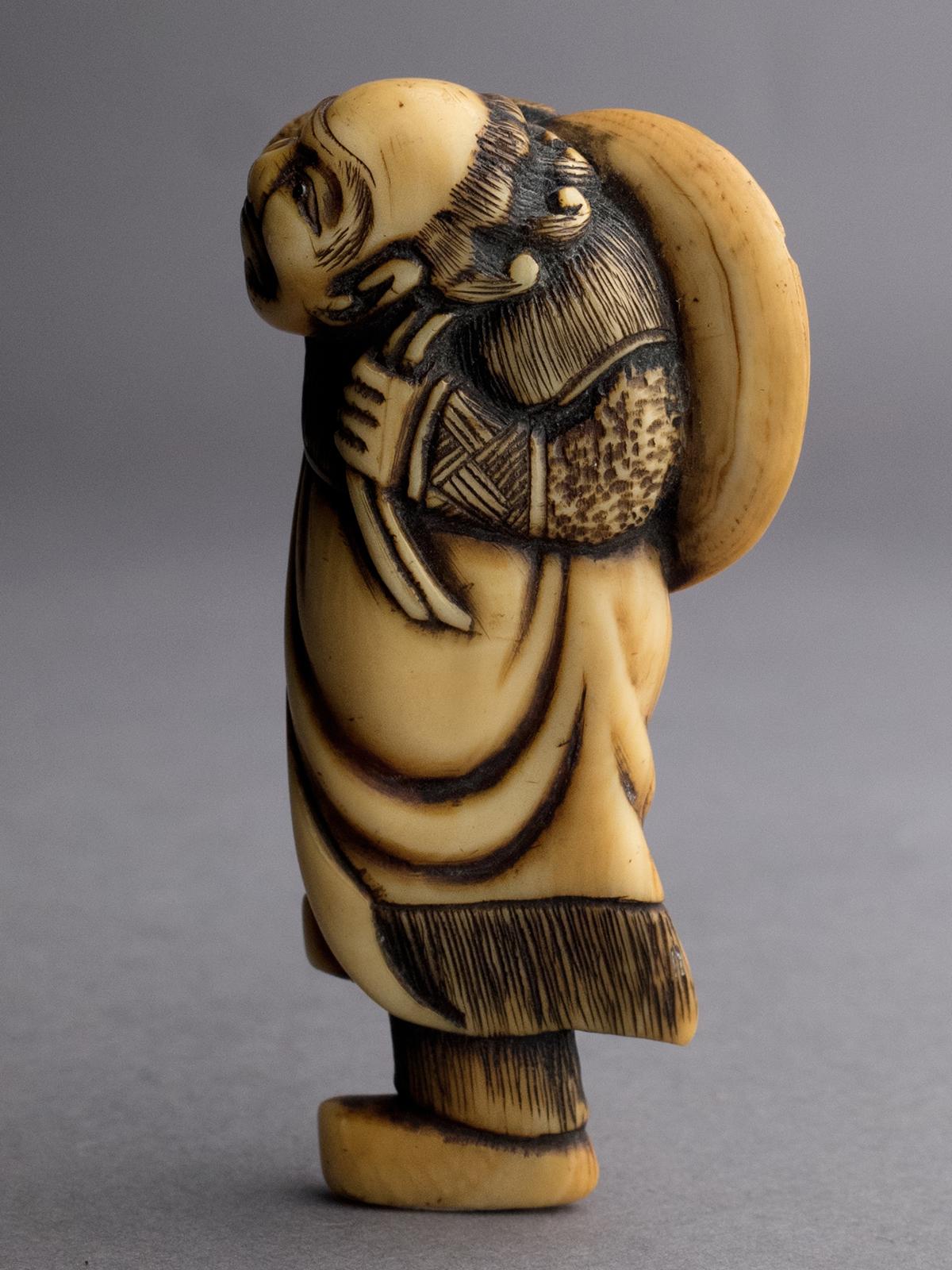 Rare 18th-Century Ivory Netsuke of a Man with Straw Hat – Edo Period