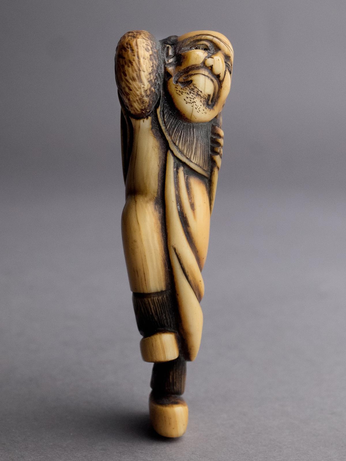 A finely carved and early ivory netsuke representing a standing man carrying a large straw hat over his shoulders. The figure is rendered with a powerful sense of movement — his shoulders lifted, beard slightly tilted, and garments cascading in rhythmic folds. The carver achieved remarkable depth using dark stain to emphasize the texture of the beard, woven hat, and the drapery’s contour lines.