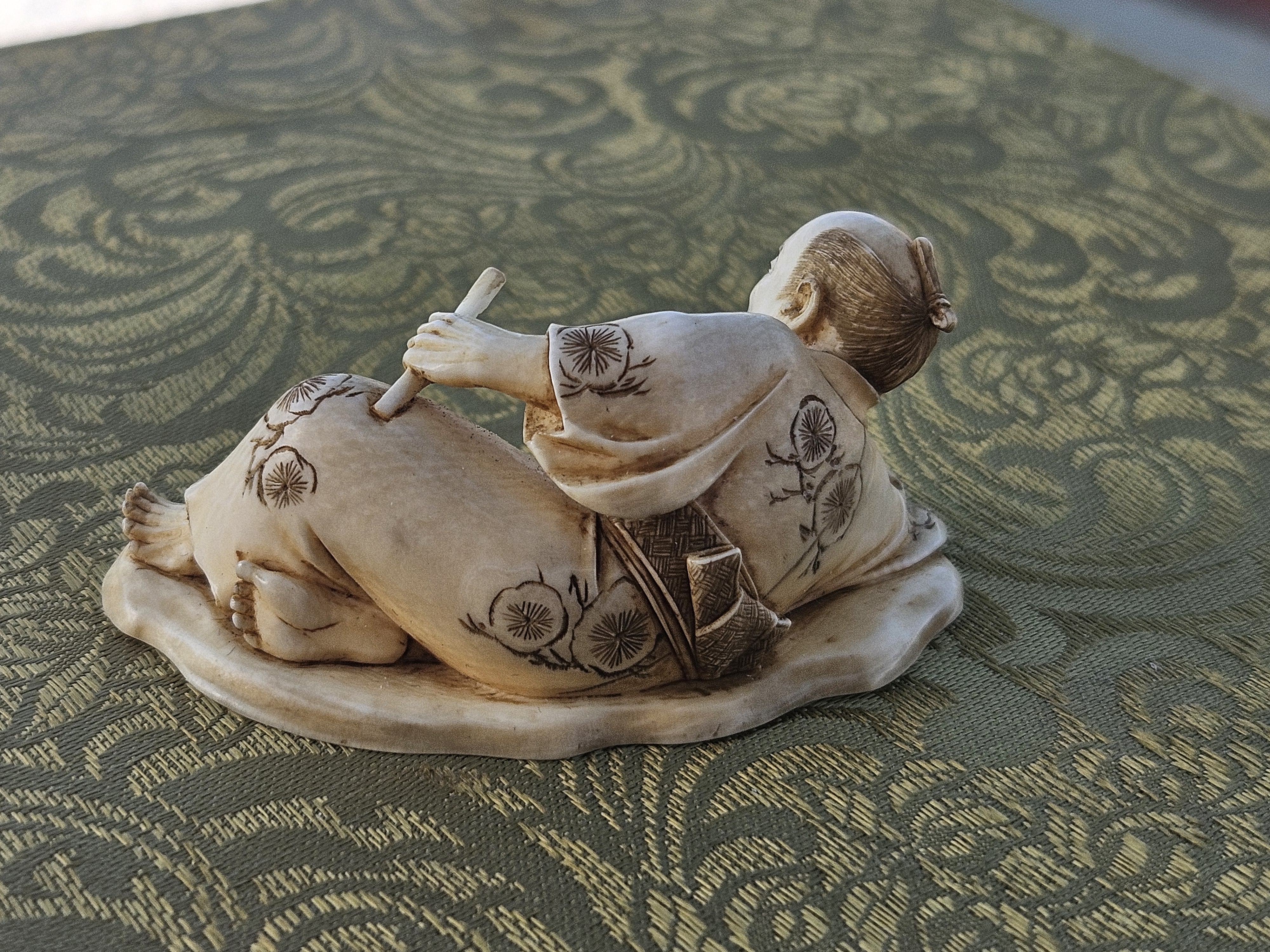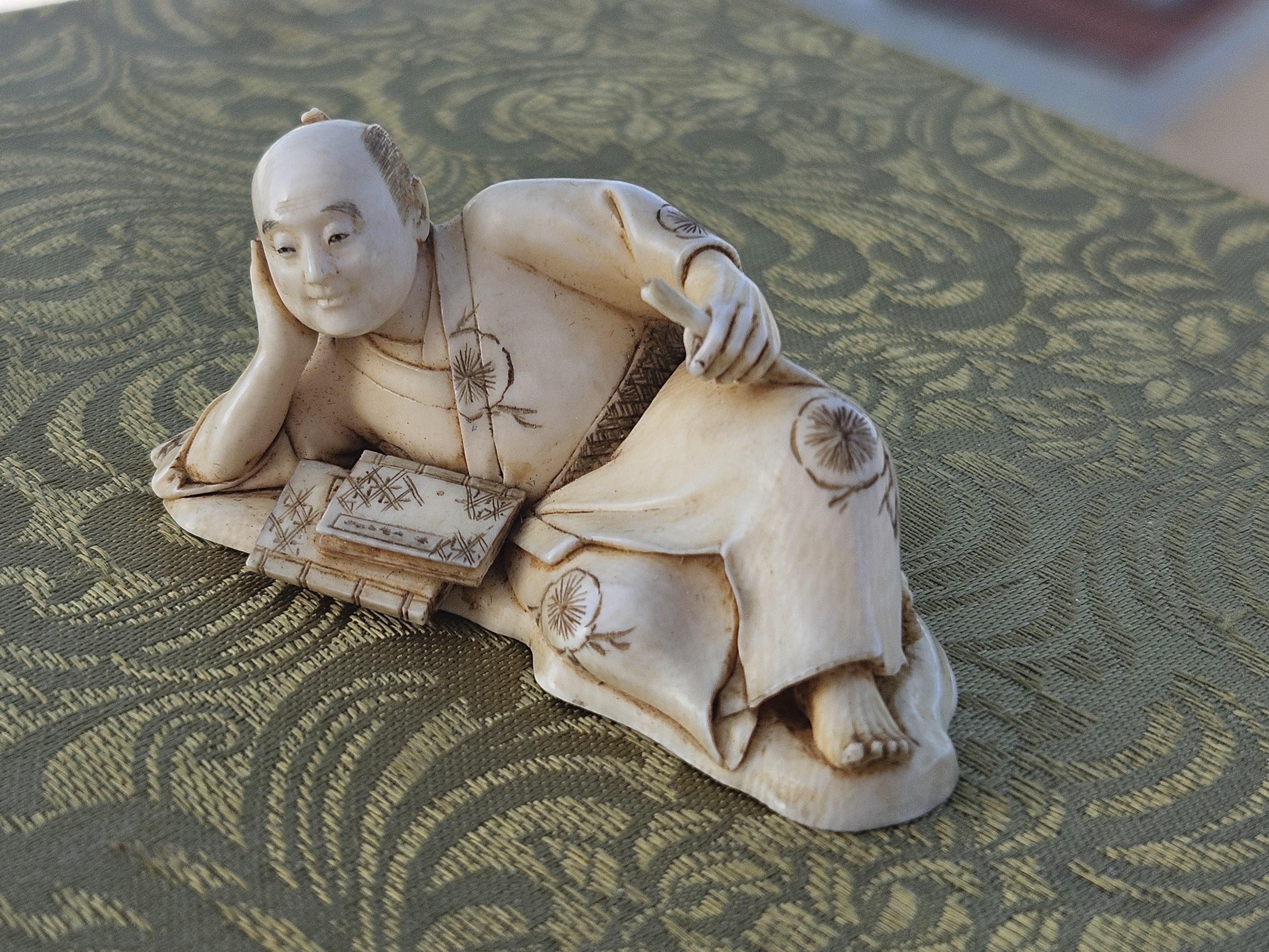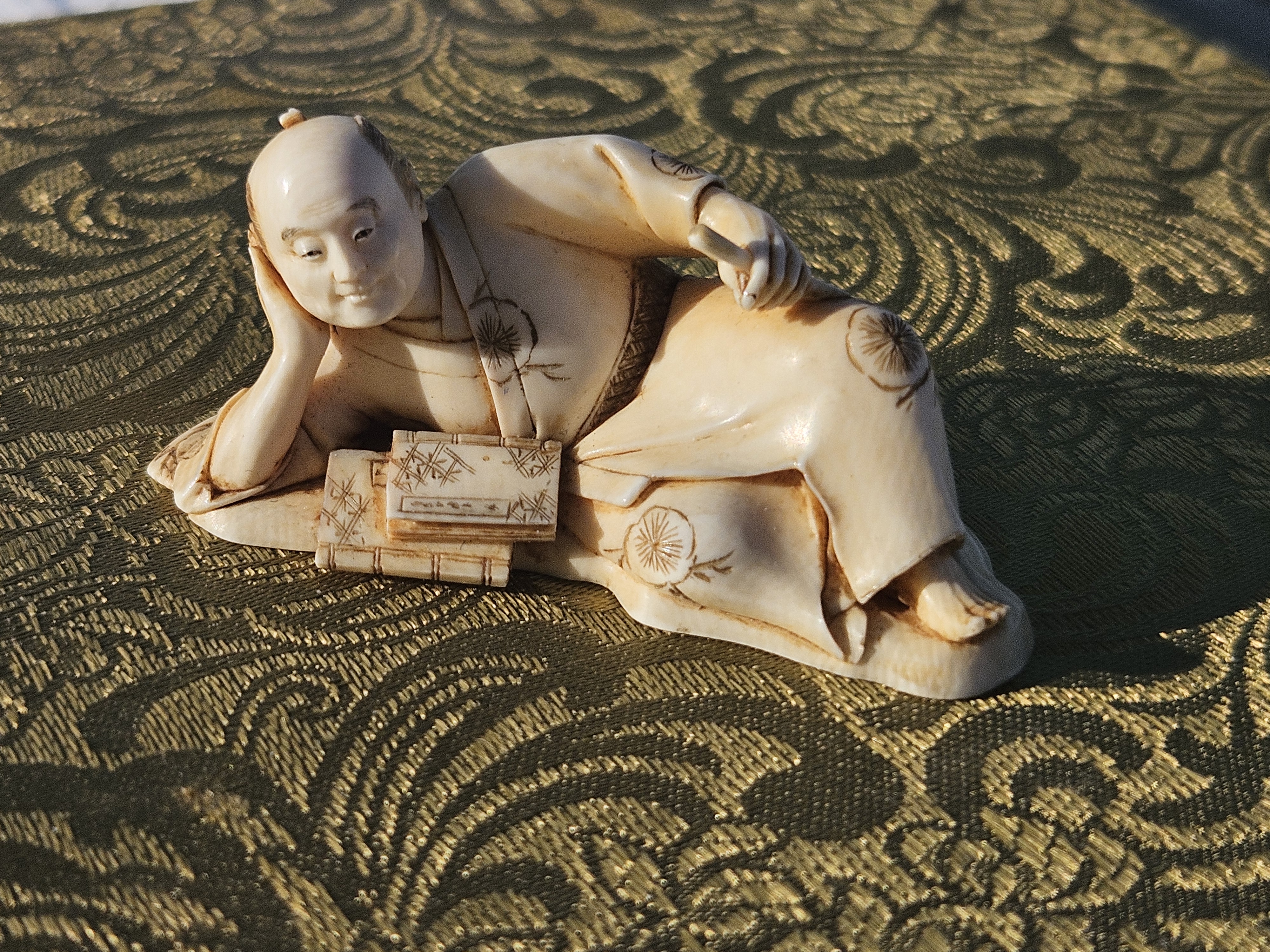 This composition of a reclining literatus symbolizes scholarly devotion and contemplative peace — a popular theme among netsuke carvers in the Edo and Meiji periods, reflecting admiration for the cultured ideals of Chinese literati.