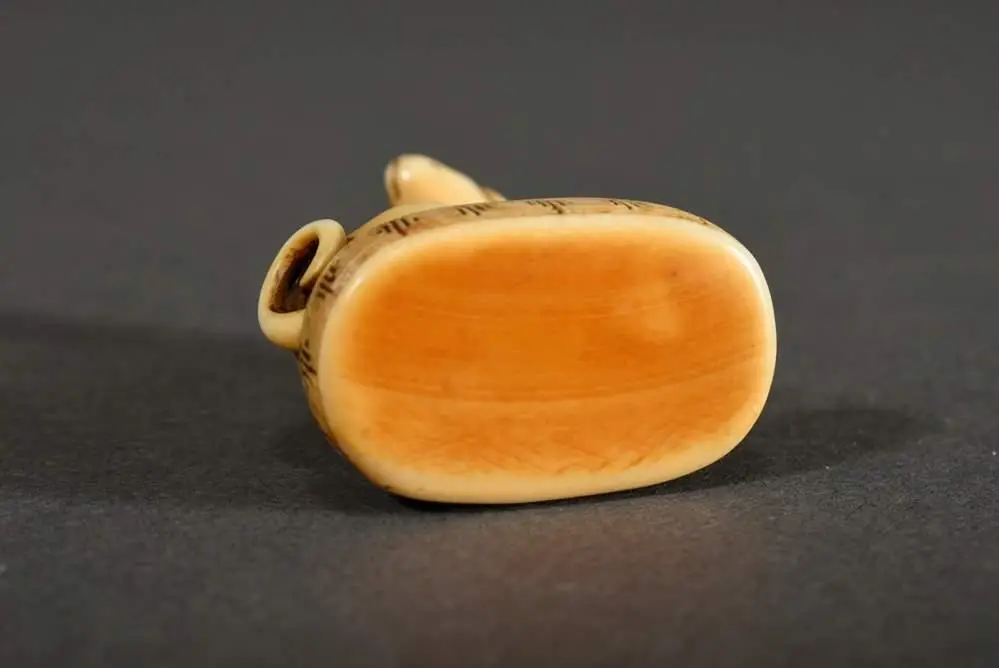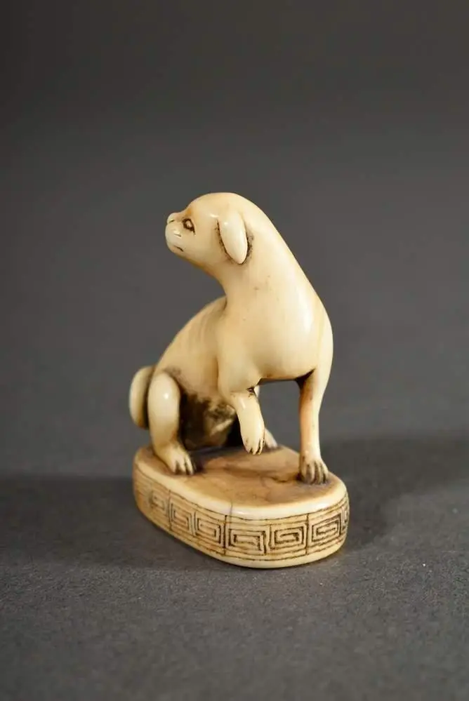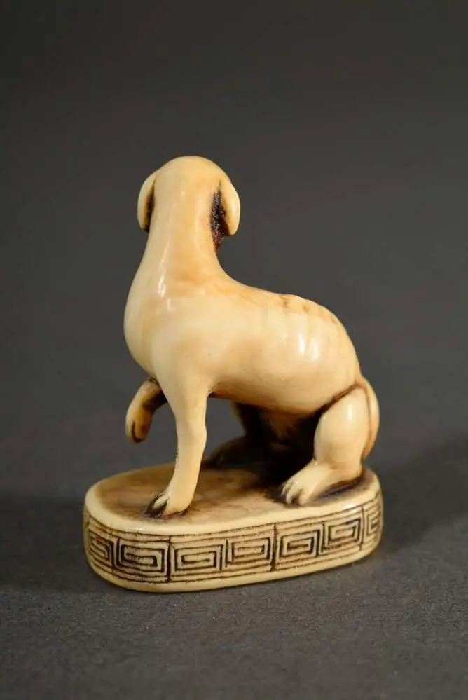 Sitting dog with raised paw on an oval plinth with engraved meander band, natural Himotoshi